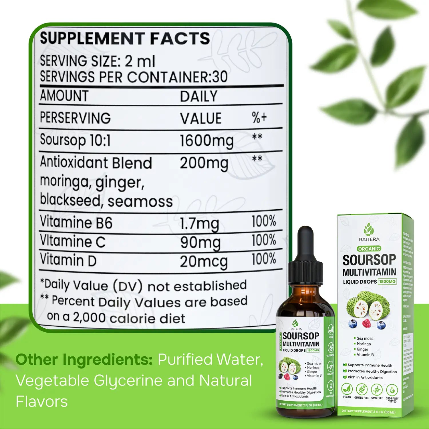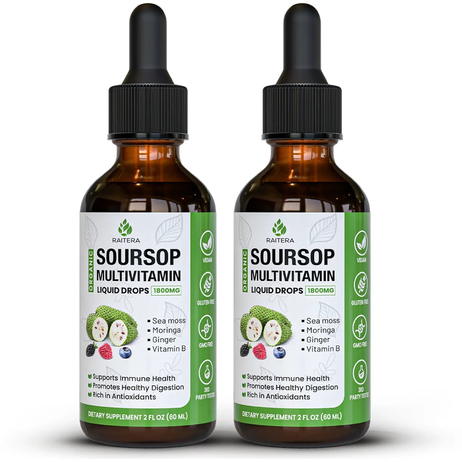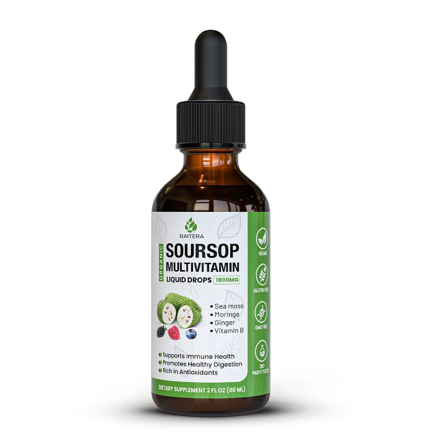 Experience nature’s superfoods in every drop with Raitera Soursop Multivitamin Liquid Drops. Packed with antioxidants, vitamins, and organic botanicals, this vegan and gluten‑free formula helps strengthen immunity, aid digestion, and boost energy. The liquid form ensures fast absorption and quick results, making daily supplementation simple and effective.